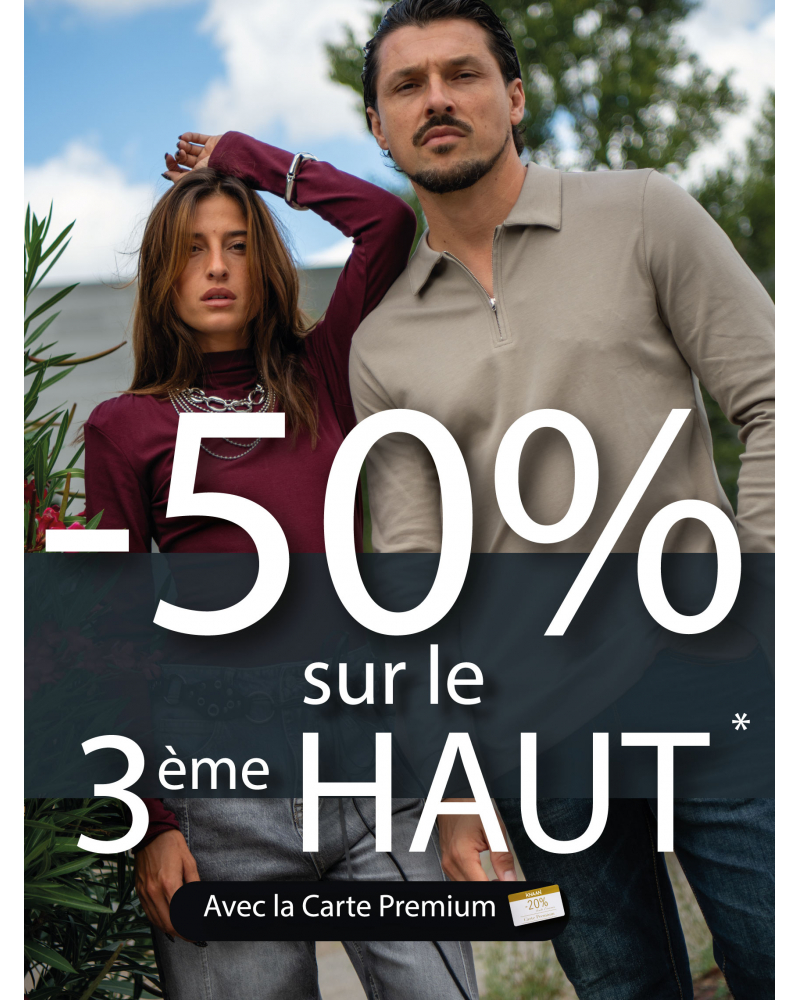 Du 29/09 au 02/11/2025 : -50% sur le 3eme Haut pour les clients titulaires d’une Carte Premium en cours de validité. Hors promotions en cours, hors gilets, vestes, manteaux, robes et tuniques.